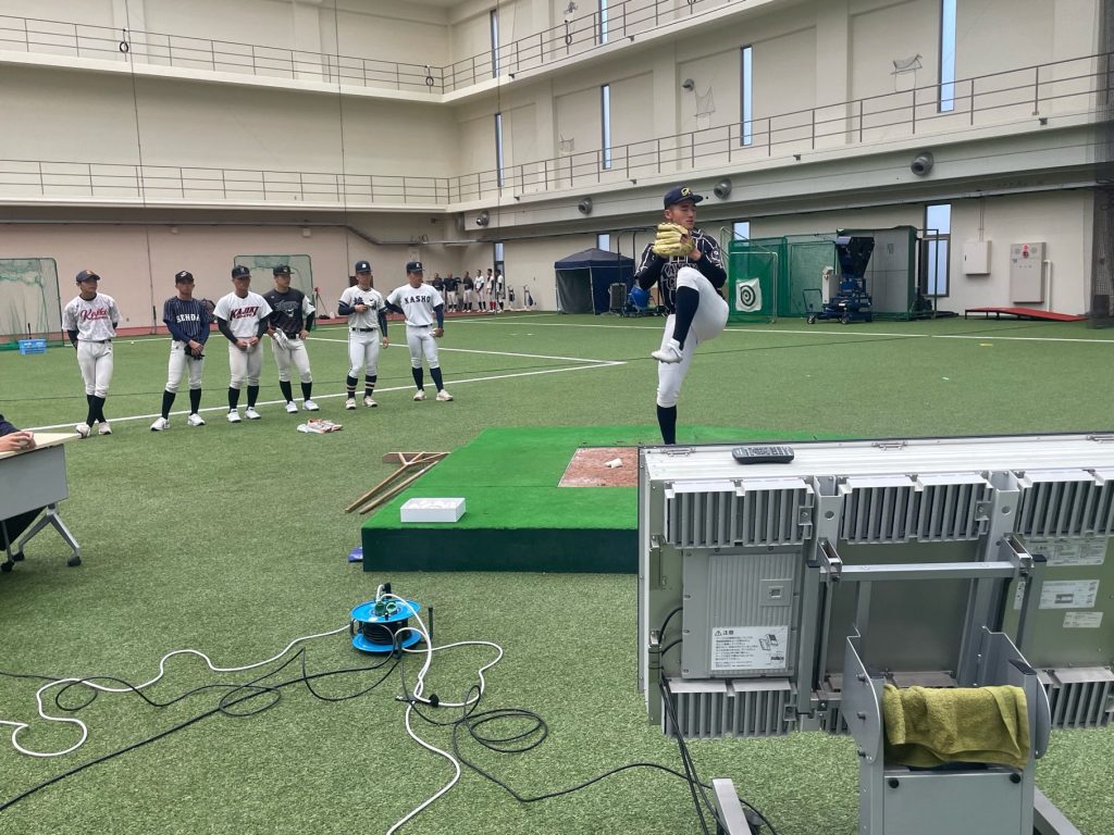 打撃測定では、打球速度や打球角度はもちろん、バットスイングスピードや軌道の測定も行いました。高校生同士で競い合う姿、大学生の打球速度と比較す選手の姿など伸び代がありまくりな選抜チームの選手達でした。