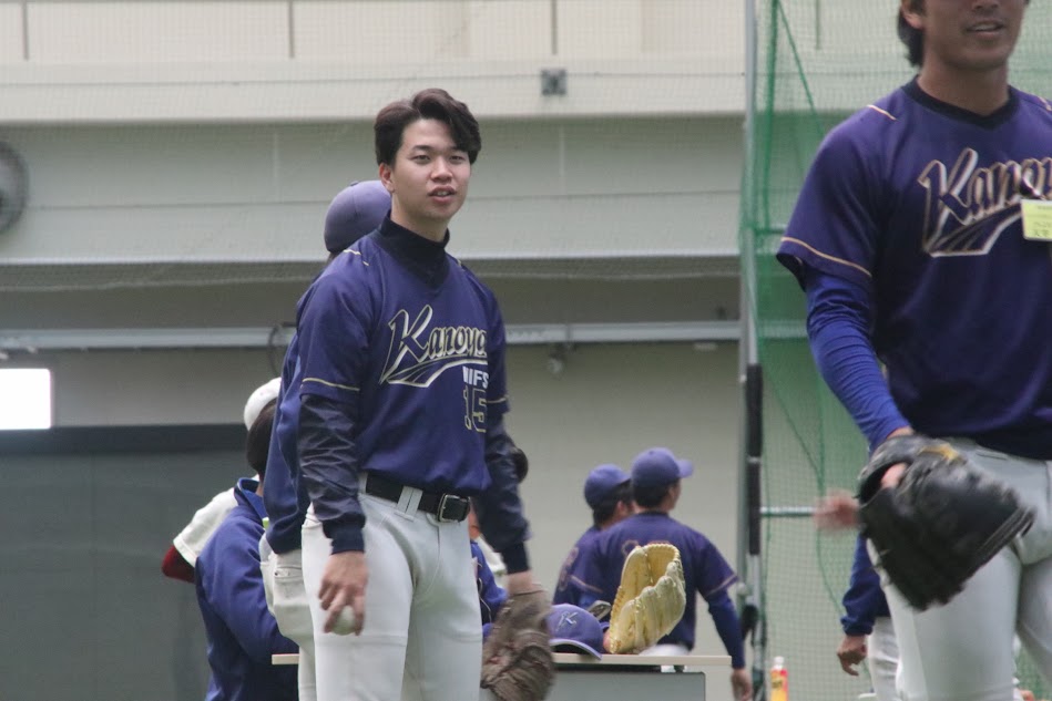 大学生とマンツーマンで普段の練習方法や変化球の投げ方などを細かく指導しました。